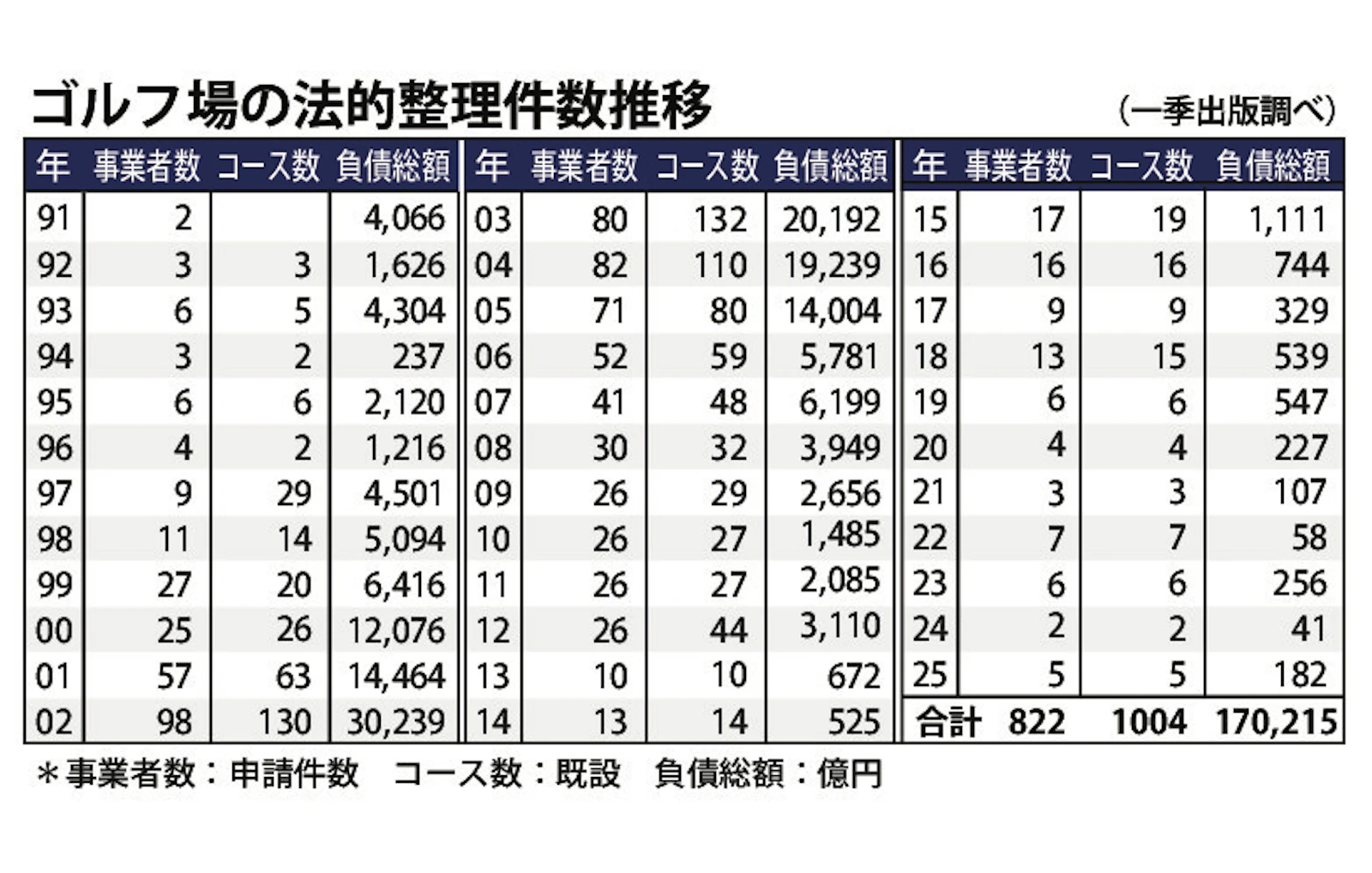 バブル崩壊後の1991年からの累計では1000コースの大台を突破し、1004コース(822件)となりました。当社の集計によると、ゴルフ場全体の46%と約半数が法的整理を申請したことになります。負債総額は17兆396億円に上りますが、近年は金融債務や預託金債務が少なくなり、大型倒産は減少傾向にあります。