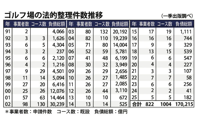 ゴルフ情報誌を発行する一季出版の調べによると、25年の会員制ゴルフ場の法的整理は申請5件(既設5コース)・負債総額181.7億円でした。件数、コース数ともに前年より3件増えましたが、7年連続一桁に収まりました。関東圏では31CC(9H・茨城)を経営するリコオが10月に民事再生法の適用を申請し、自主再生を目指しています。